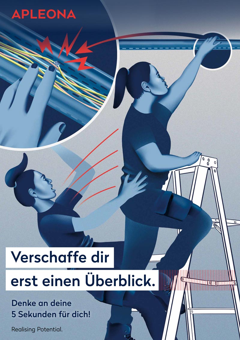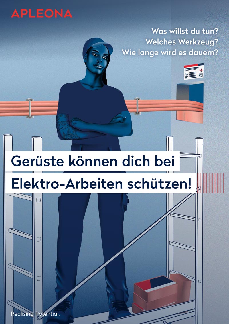 Apleona is a facitity management that commissioned four poster illustrations to raise awareness among their electricians about how to perform electrical work properly and safely.